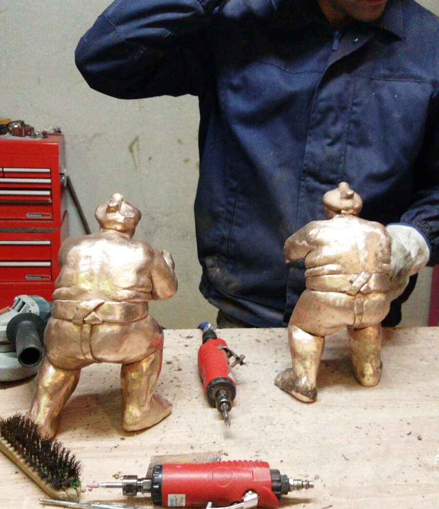 Plongez dans l'univers des bronzes,... ici le combat de Sumo IV ; nous sommes à la fonderie, on est en place et nous allons faire la patine avec les acides et le chalumeau. A chaque bronze, je contrôle la cire et ensuite je reviens à la fonderie pour faire la patine avec le fondeur, c est un moment crucial pour la patine du Bronze!.